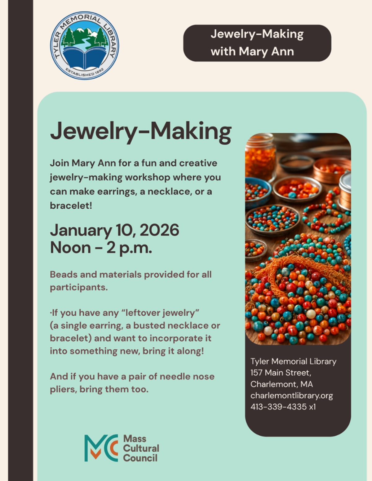Saturday, January 10, 2026, 12:00 pm until 2:00 pm Tyler Memorial Library